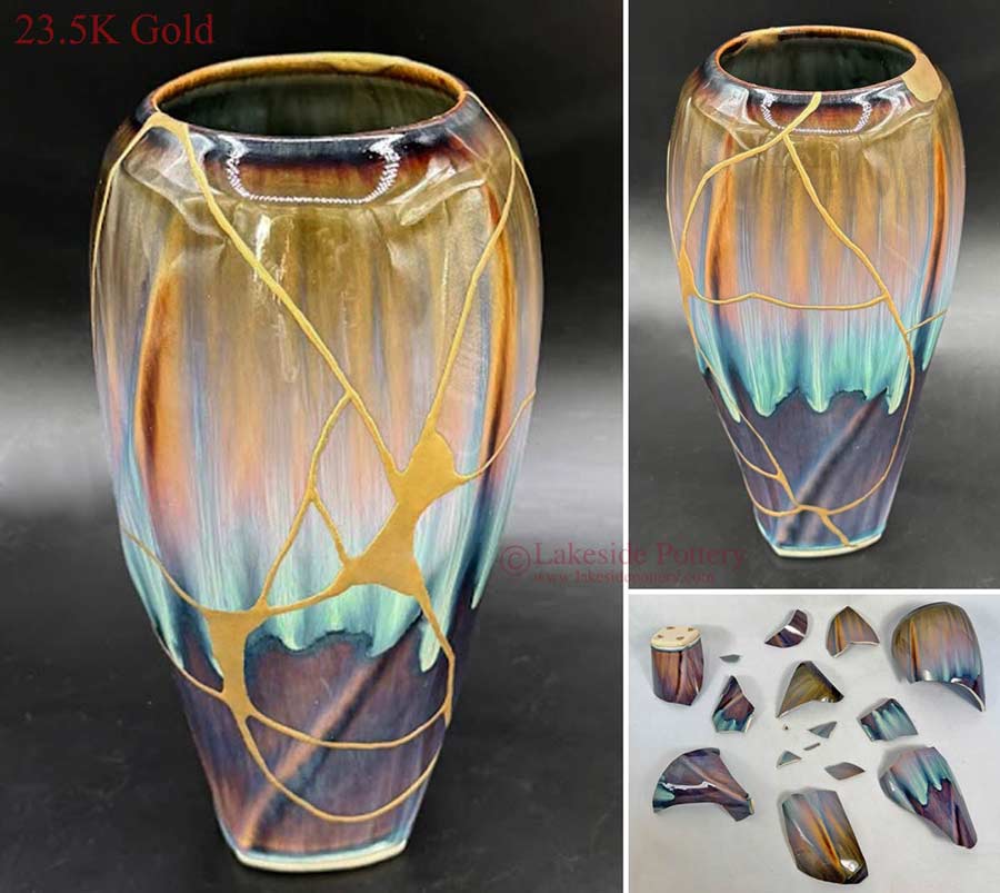 Before and After Kintsugi - Large Kintsugi Raku vase before and after repair