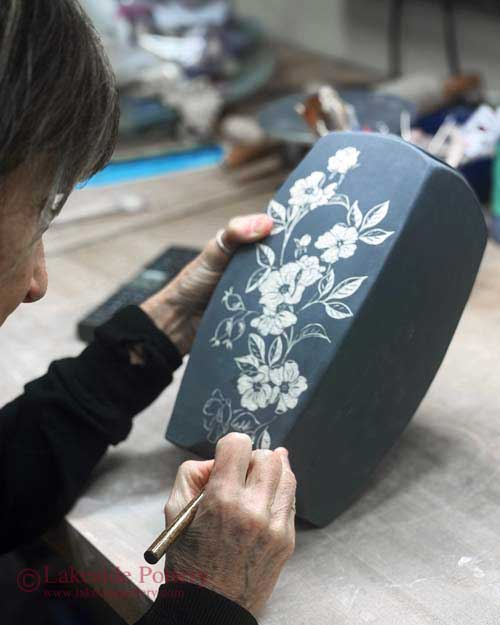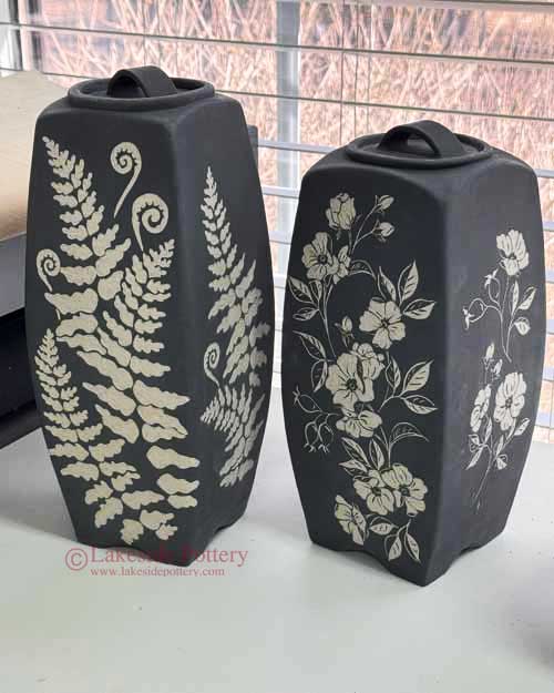 This project shows how sgraffito can be used on curved surfaces with detailed designs. Working on urns requires careful planning, steady carving, and attention to drying stages. The steps below illustrate how layered underglaze and precise line work create bold, intricate patterns that elevate a simple vessel into a refined decorative piece..