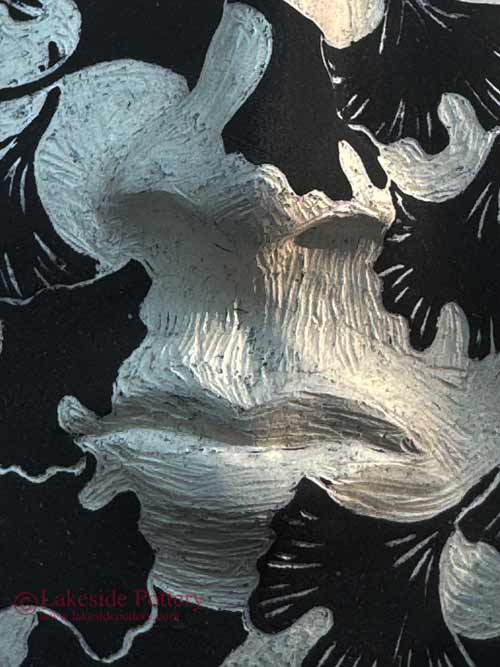 See a close-up photo of the surface at the bisque stage where the scratch marks are still visible. Once the clear glaze is applied and fired, it pools slightly into the carved areas, softening and masking most of those marks. When you touch the finished piece, you can feel that the black uncarved areas are slightly higher than the white, giving the surface a gentle raised texture.
