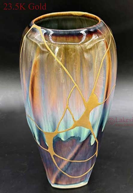 The prices of our Kintsugi art varies depending on the number of break lines and their length, and the value of the ceramic piece itself. There is a significant cost difference between true gold powder and our optional metal gold effect process. Most prices range from $100 to $400 but can increase significantly, by as much as 2.5 time greater cost, when true 23.5K gold is used.