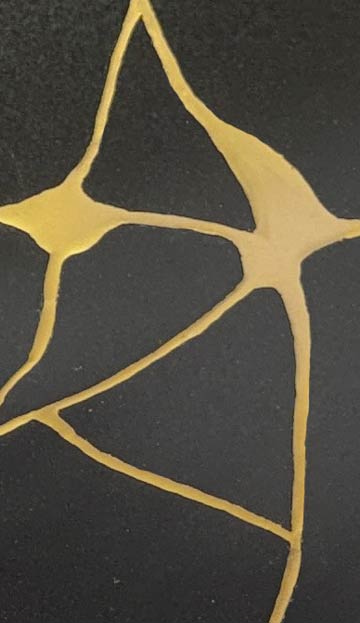 Gazing at a Kintsugi art work, we are reflecting on its metaphor -- there is beauty in imperfection, scars are experiences of life, breaks can heal and aging is a natural and beautiful process of life. A Kintsugi life suggests that, like a ceramic piece, there is value to missing pieces, cracks and chips and one may find a new purpose, rebirth and trust by not concealing the imperfections and flaws that have come from living but by giving them respect and even gratitude.
